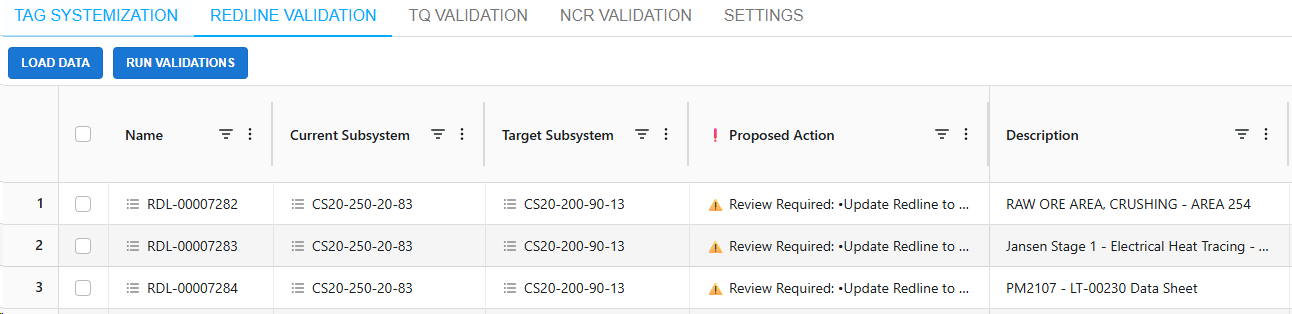 After completing the import/adding of tags, updating and validation of the tag to subsystem relationships on the Tag Systemization tab, secondary validation is highly recommended for redlines, TQs, and NCRs.