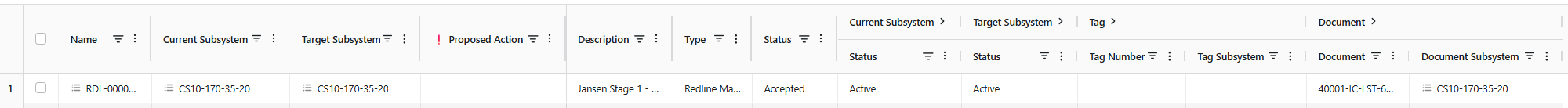 Result. Relevant redlines, TQs, and NCRs will populate the table, with a proposed action.