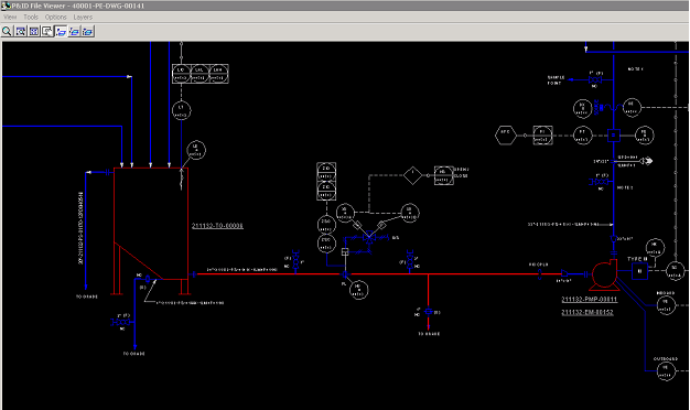 The following figure shows the P&ID of the correlated content in red, which means it was correlated with property mismatch. The reason for the mismatch is that the property data was not copied from the design basis.