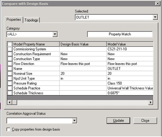Result: The Compare with Design Basis dialogue opens, showing the difference in property data between the S3D model and Design Basis.