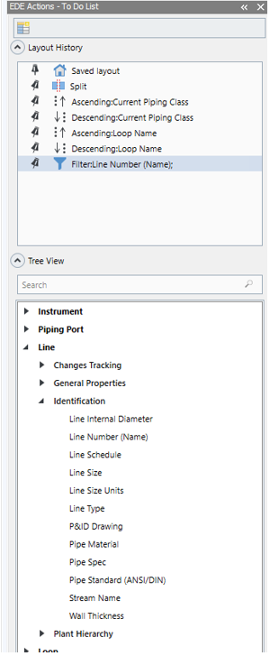 The EDE Actionstab contains the SPI item types that are relevant to the To Do List, for example, if a line was retrieved from SP&ID to SPI, the line item type will be shown in the View Actionstab. These item types are categorized by class, with each item type showing its properties under it. Searching for an item type property brings up a shortlist of results based on the search criteria. You can double-click or drag and drop the property to the To Do List and create a new column.