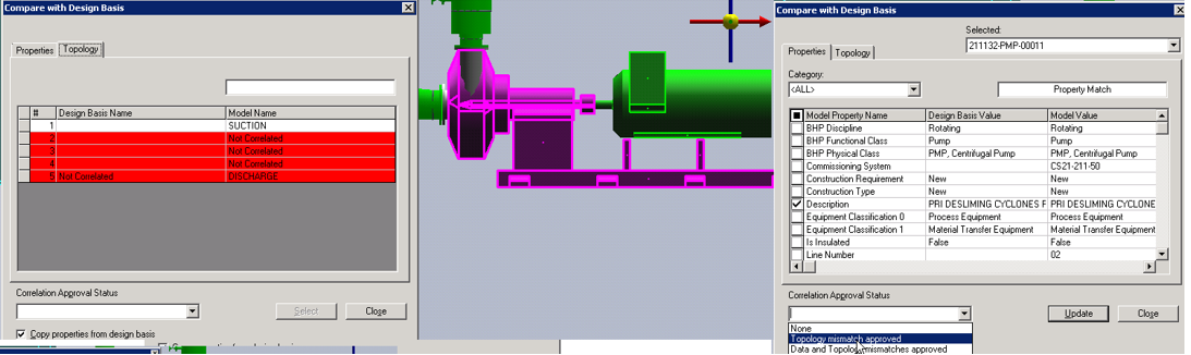 Since only the suction nozzle is connected, while the other nozzles are disconnected, there is topology mismatch. In this example, the Correlation Approval Status is set to Topology Mismatch Approved.