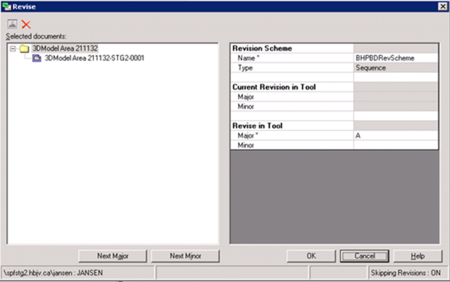 3. Click the Next Major button to assign a revision to the model. As this drawing is revised for the first time, revision A is assigned.