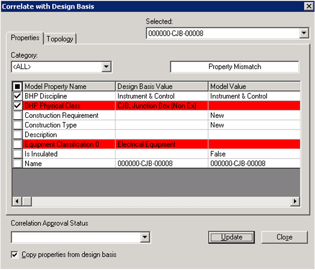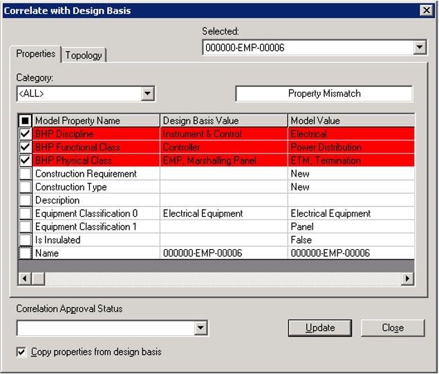 Result: The Correlate with Design Basis dialogue opens. This allows you to update the model attribute values from the design basis.