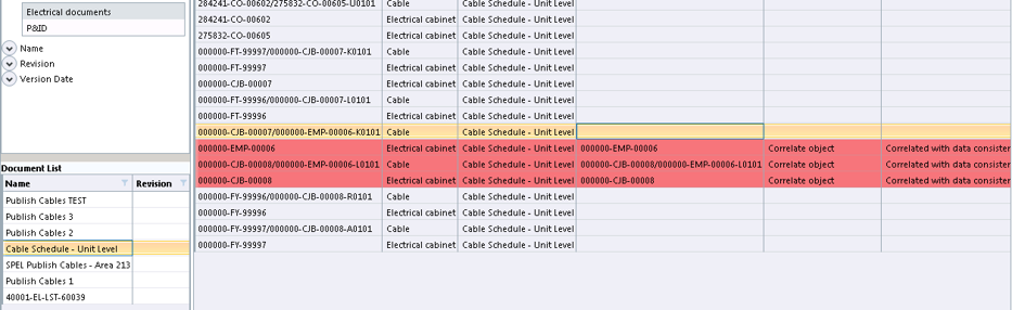 3. In the lower section of the left-side pane select Cable Schedule - Unit Level to filter the objects from the retrieved cable schedule. As shown in the following figure, the cable is correlated, but the "To" and "From" devices are not.