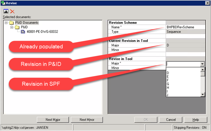 The revision to use in SPF: In the Revise in Tool section, under Major*,select the same revision as the one displayed under Current Revision in Tool. The revisions in Smart P&ID and SPF must match.