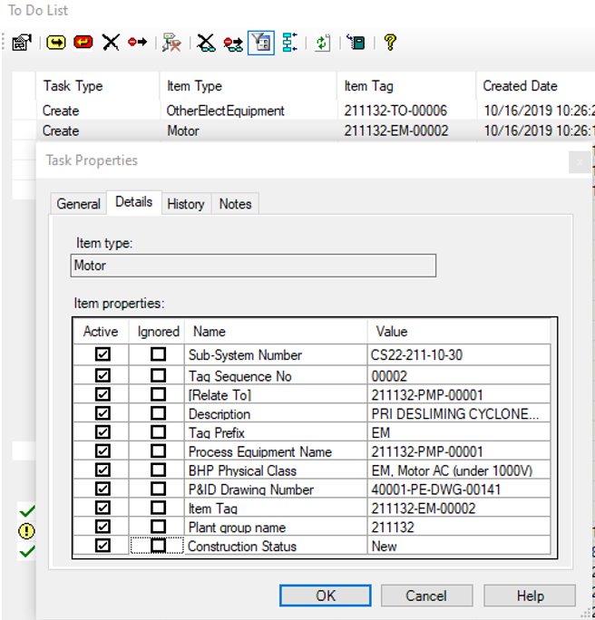 Note: When a task runs, the status of the task and the Run Date and Run By properties are updated. If the task is completed successfully, the status is updated to Completed. If a problem occurs, the task status is updated to Error . If a Create task is completed successfully, but the software has made changes to the item tag, the status is updated to Completed with Warning . When the status is Error or Completed with Warning, a time stamp and error message are added to the Notes area on the General tab of the Task Properties dialogue box.