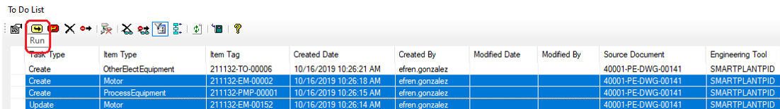 The To Do List enables users to manage tasks that need to be run within a Smart Electrical database in order to keep the plant current with information from the SmartPlant Foundation database. To open the To Do List, expand the SmartPlant menu from the top ribbon and select To Do List... All commands associated with the To Do List are located on the To Do List toolbar. The functionality of each command is explained below.