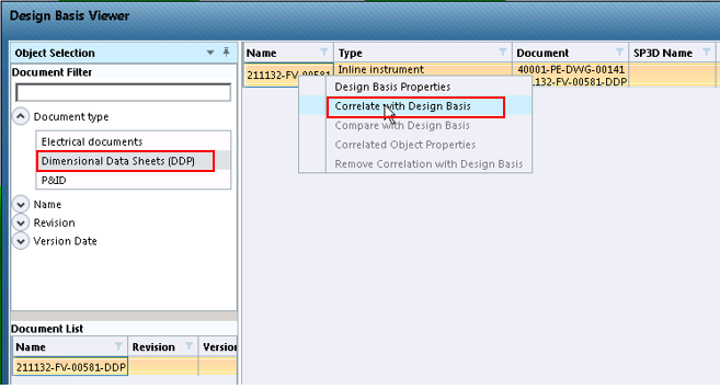 4. Right-click the instrument shown under the Name column and select Correlate with Design Basis.