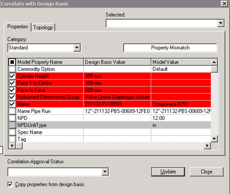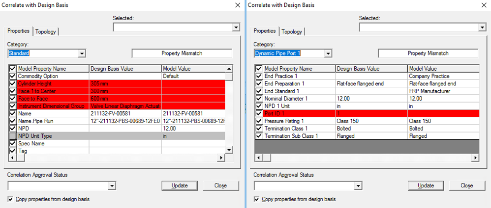 6. Review the dimensional and port data, ensuring to check the checkbox Copy properties from design basis.